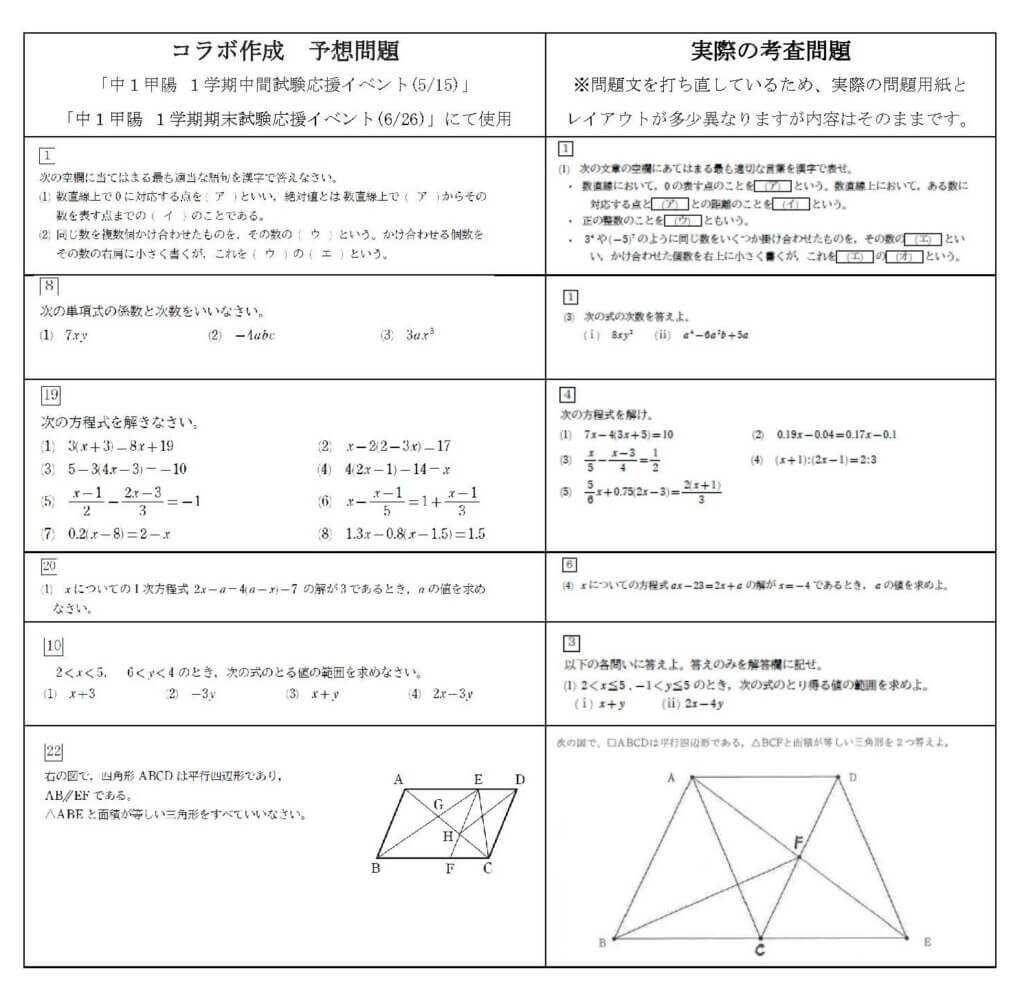 中1甲陽コンプリート数学のクラスでは、完全に学校に準拠した内容で授業を進めています。基本的には学校の学習内容を少し先取りし,試験前に試験範囲を復習する形です。そうすることにより,コラボで初めての学習⇒学校で2度目の学習⇒コラボの試験前対策による復習と,同じ単元を3度学習することができます。また,普段の授業では宿題範囲からの小テストを毎回実施しています。代数分野でも,今後は記述式試験に変わっていきます。答えが合っているかだけではなく,過程を正しく書けているかも添削によって指導しています。