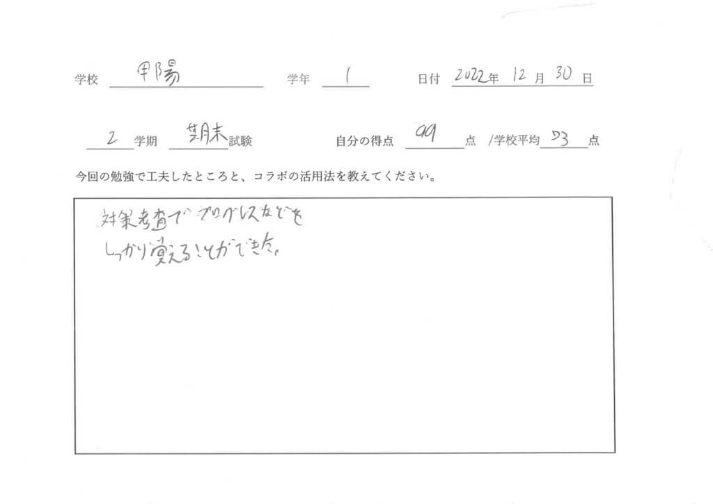 | 1学期中間考査 | コラボ在籍甲陽生平均 | 学校平均 |